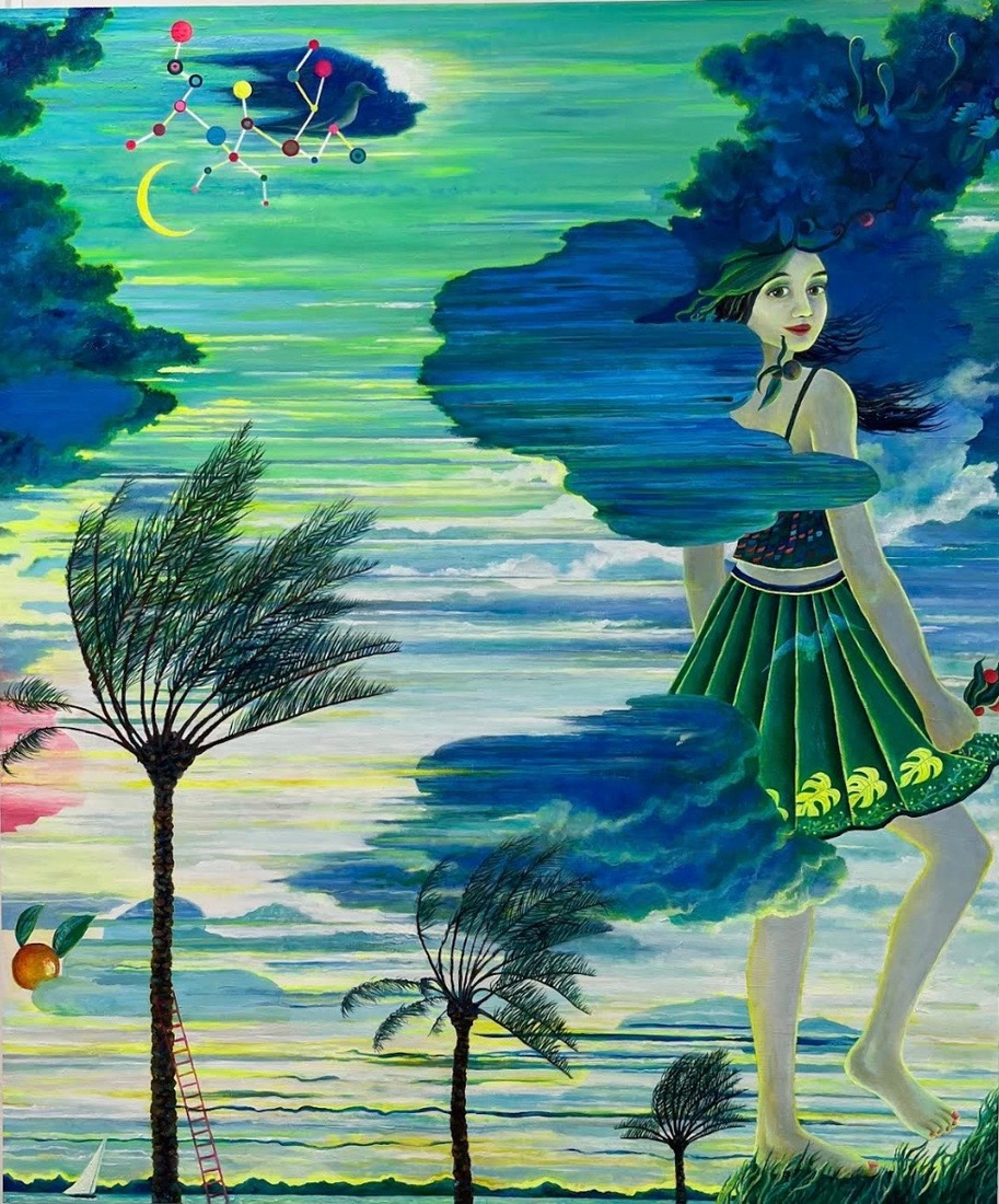Masako and the Night Sky Reworked 2022 (2005) oil and acrylic on canvas 56 x 30"
